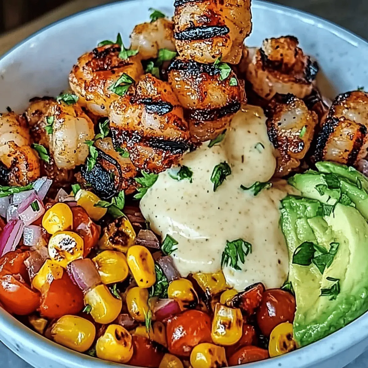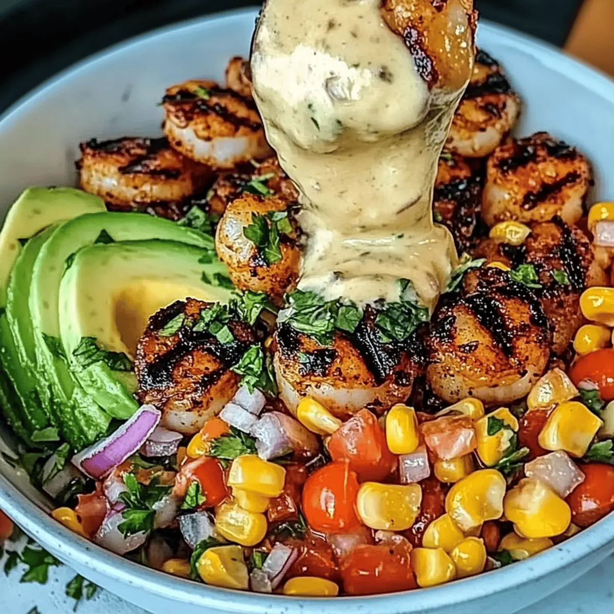 Delicious Grilled Shrimp Bowl with Avocado, Corn Salsa & Creamy Garlic Sauce