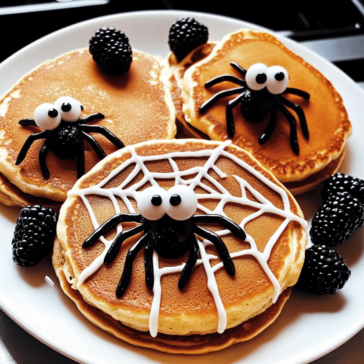 - Place 2-3 blackberries on top of the icing web on each pancake, positioning them as the spider bodies.
